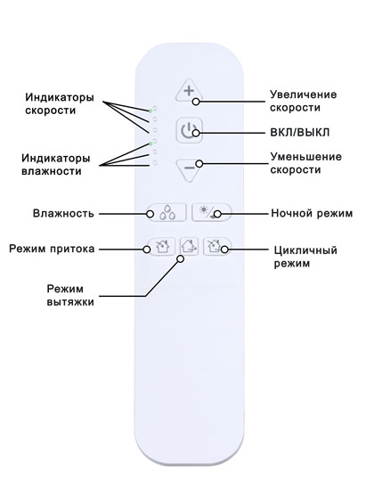 активирует этот режим, в котором рекуператор работает на самой тихой скорости и только в режиме рекуперации. При этом все остальные кнопки управления, кроме вкл/выкл, блокируются и становятся не активными! Для выхода из ночного режима необходимо повторно нажать кнопку «ночной режим»